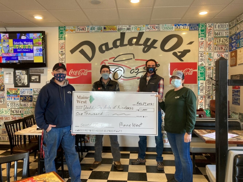 (l-r, rear) Maine West members Mike Wilson (Northern Forest Center) and Brendan Schauffler (Oxford County Wellness Collaborative) present a check to Aaron and Amanda Ouellette of the Daddy O’s Acts of Kindness Foundation.