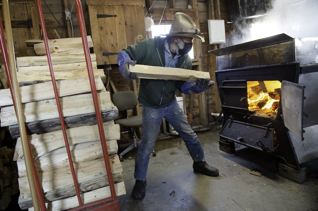 Roger Gervais of Wales feeds the evaporator with wood Monday at Jillson’s Farm & Sugarhouse in Sabattus. Gervais cleaned the evaporator by boiling water in anticipation of making the first batch of maple syrup Wednesday morning. “The sap is really going to run good,” farm owner Ed Jillson said about rising daytime temperatures this week. Jillson said the last of 1,500 buckets were hung Sunday. “The season is starting right on time,” he said. This is the 22nd year Gervais has been making syrup on the farm. “The truth is, we always say this is going to be the best year ever,” Gervais said. Daryn Slover/Sun Journal Buy this Photo