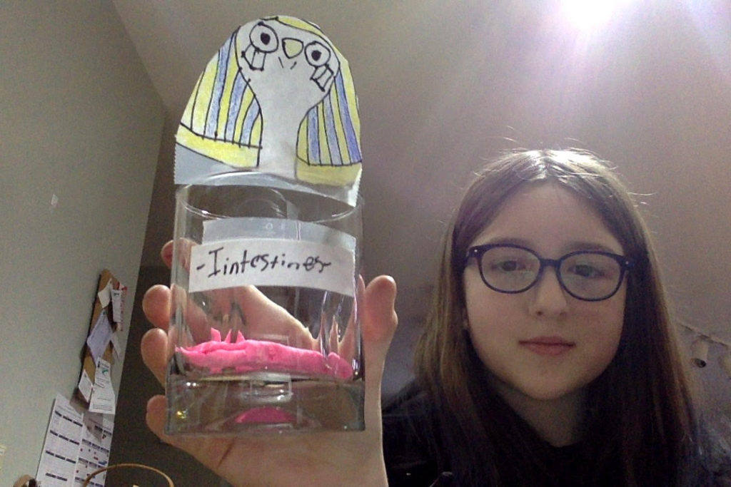 At times, we have all had to go remote for Covid 19 related reasons. Ms. Killam used this opportunity in Social Studies to have her students continue learning about Ancient Egypt in a more hands on and creative way. She assigned her students with a task to create an Egyptican artifact right in their own home. Some examples of student creations were hand painted canopic jars, 3D pyramids, and one student even turned himself into a mummy!