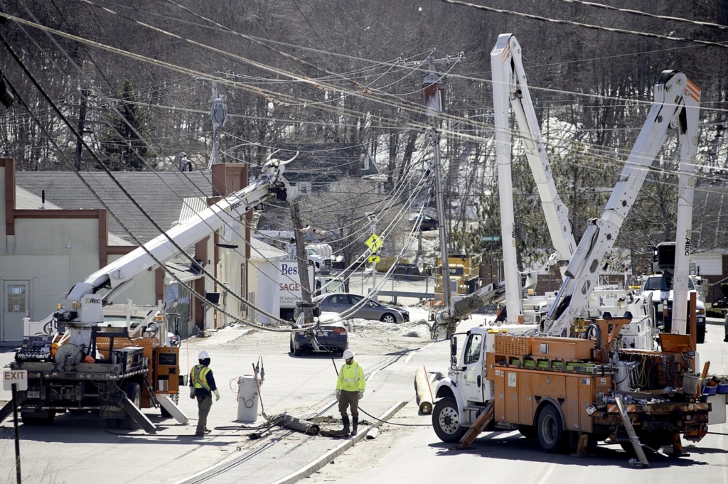 Central Maine Power workers replace a utility pole Tuesday along Bartlett Street in Lewiston. According to witnesses, a car hit the pole around 8:30 a.m. Workers had to cut power to some businesses while the pole was replaced. Daryn Slover/Sun Journal Buy this Photo