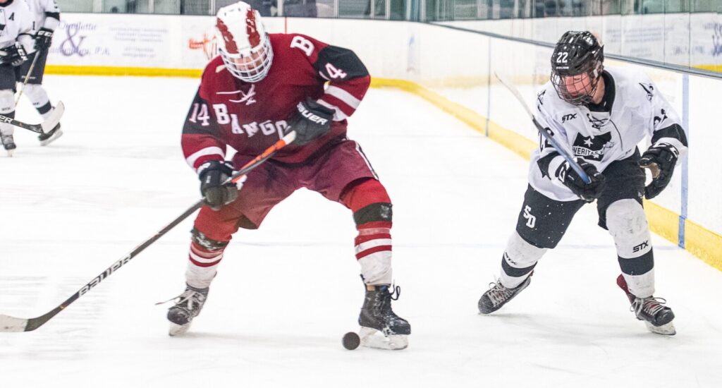 Saint Dominic Academy’s Lucas Pushard, right, challenges Bangor’s Drew Dorr for the puck during a February 2020 game at the Norway Savings Bank Arena in Auburn. Russ Dillingham/Sun Journal Buy this Photo