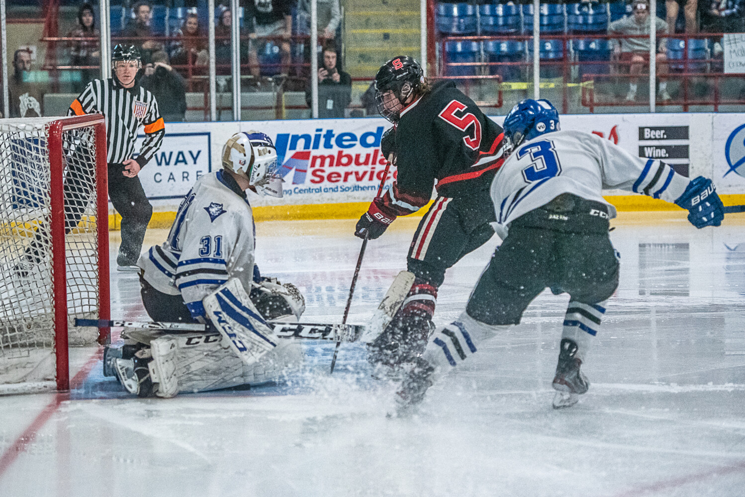 Edward Little’s Will Cassidy attempts to score a goal against St. Dom’s goalie Nate Jones during a game last month at the Norway Savings Bank Arena in Auburn. Andree Kehn/Sun Journal Buy this Photo