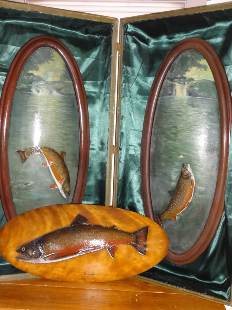If you check the definition of the word mezzo you will find it described as “the projection of figures…from a background.” His business pamphlet explains further: “The ‘Trout Mezzo’ is half of a fish mounted on an oval or elliptical convex panel of beautiful native wood which, when properly hung, gives the impression of the whole fish. At the same time, it gives the impression of a beautiful painting.
