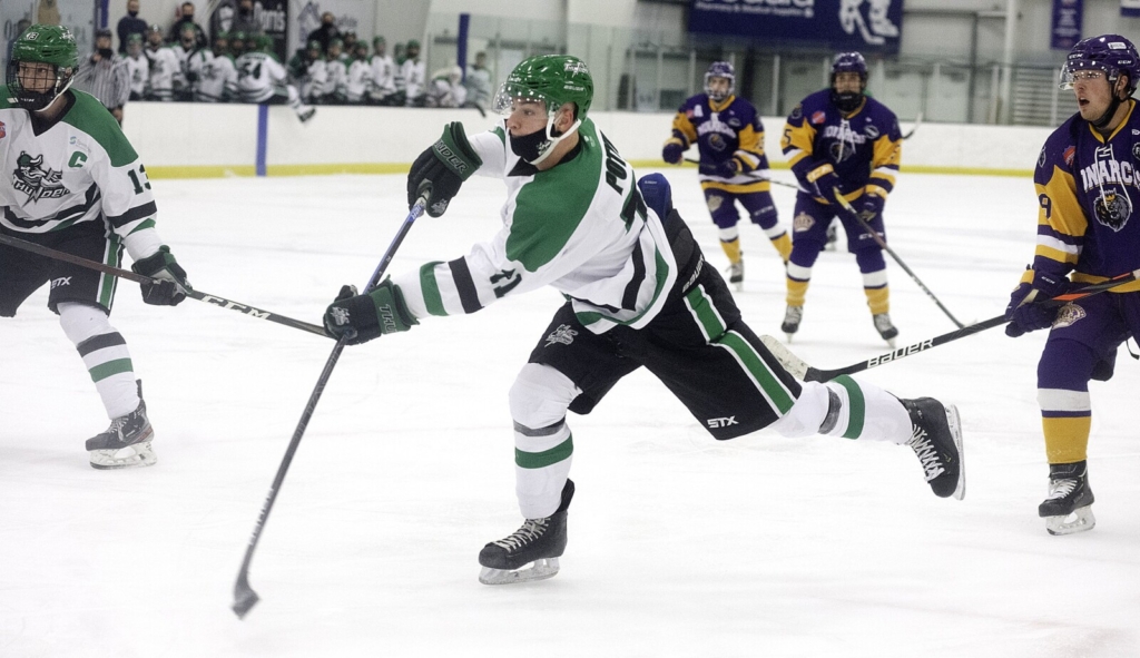 Gabe Potyk of the Twin City Thunder fires a shot on goal during a game against the New Hampshire Monarchs in November 2020 in Auburn. Daryn Slover/Sun Journal Buy this Photo