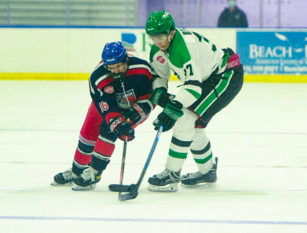 Connecticut Junior Rangers’ Liam Connors skates past Twin City Thunder forward Valeri Rykov in a game at the Advent Health Center Ice Rink in Wesley Chapel, Florida during the 2020-21 season. Josh Boyd/USPHL