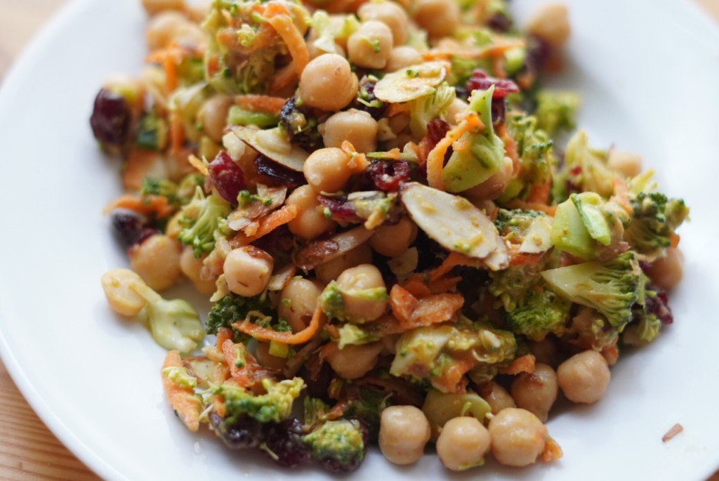1. In a large bowl, add finely chopped broccoli, chickpeas, carrot, cranberries, green onion, and cilantro. Set aside.
