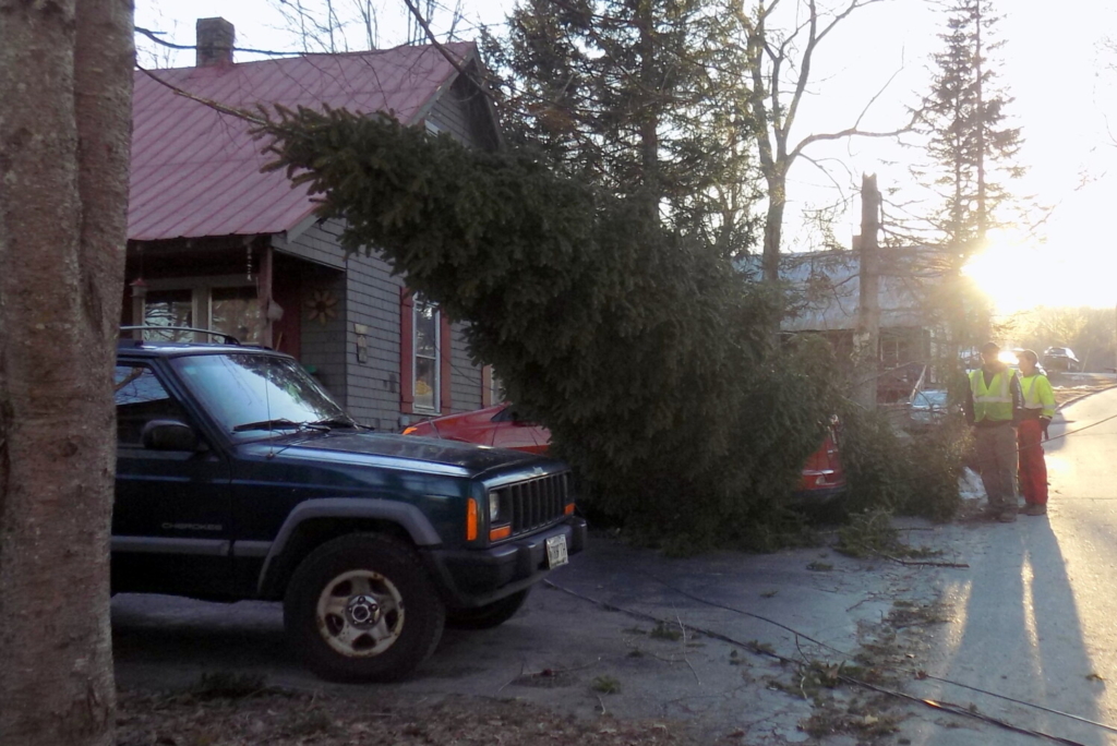 WILTON — Monday afternoon, March 29, winds toppled a spruce tree at 221 Village View pulling telephone and power lines from the home and damaging a vehicle.