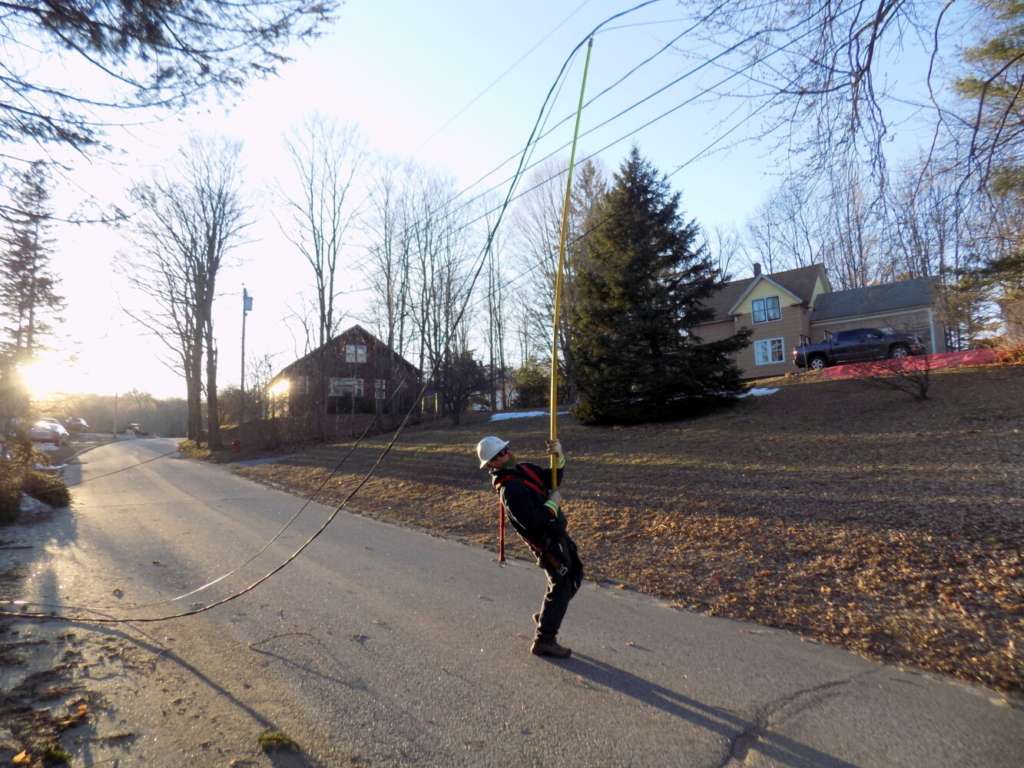 Central Maine Power Co. lineman Justin Fisher maneuvers downed lines near 221 Village View in Wilton Monday afternoon, March 29. Pam Harnden/Livermore Falls Advertiser Buy this Photo