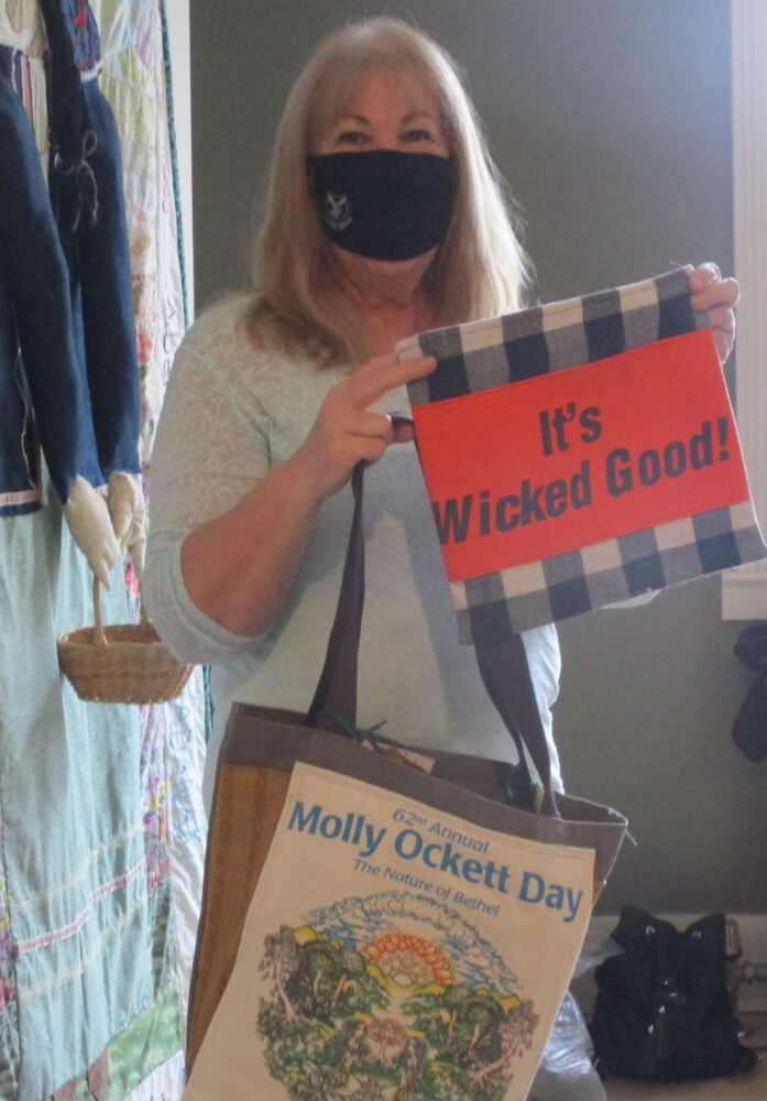 Melinda Remington holds one of the finished products and holds another that is close to completion. Bethel Citizen photo by Samuel Wheeler.