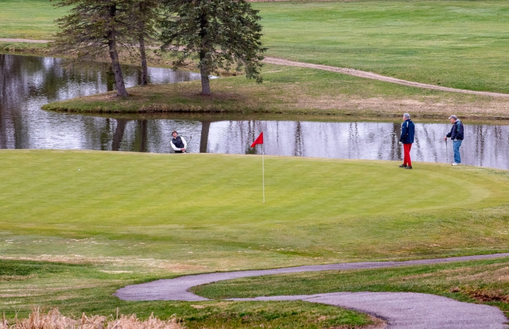 Michael McLellan of Winthrop watches his chip shot head toward the middle of the green while golfing with his father, Buster, middle, and family friend Terry Kilcoyne, right, of Winthrop. They were the first onto the course Sunday morning at Turner Highlands Golf Course in Turner. “We are so excited to be out golfing, and it’s the Masters weekend, so all is good,” Michael said after hitting his tee shot a little long. Russ Dillingham/Sun Journal Buy this Photo