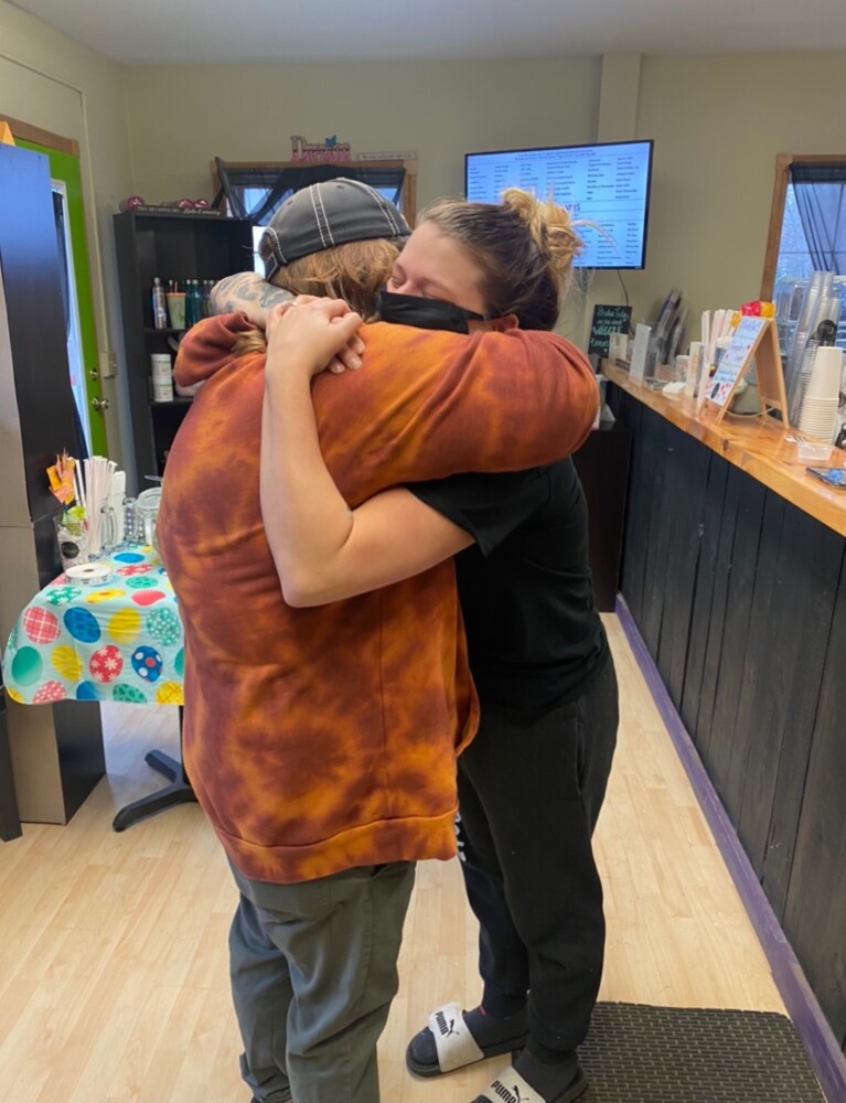 Brittanie Lynn Ritchie, Rochelle Hager’s fiancée hugs Determined Nutrition co-owner Danielle Allen. Ritchie helped the shop owners develop the RoeUrBoat tea that reflects Hager’s favorite colors, yellow and black. All of the proceeds from the pineapple and grape tea are donated to Hager’s family. Photo Courtesy of Determined Nutrition