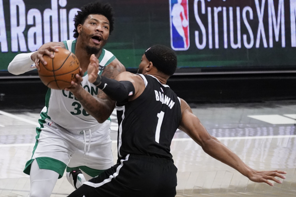 Celtics guard Marcus Smart tries to get off a shot while defended by Nets forward Bruce Brown on Friday in Brooklyn, New York. Mary Altaffer/Associated Press