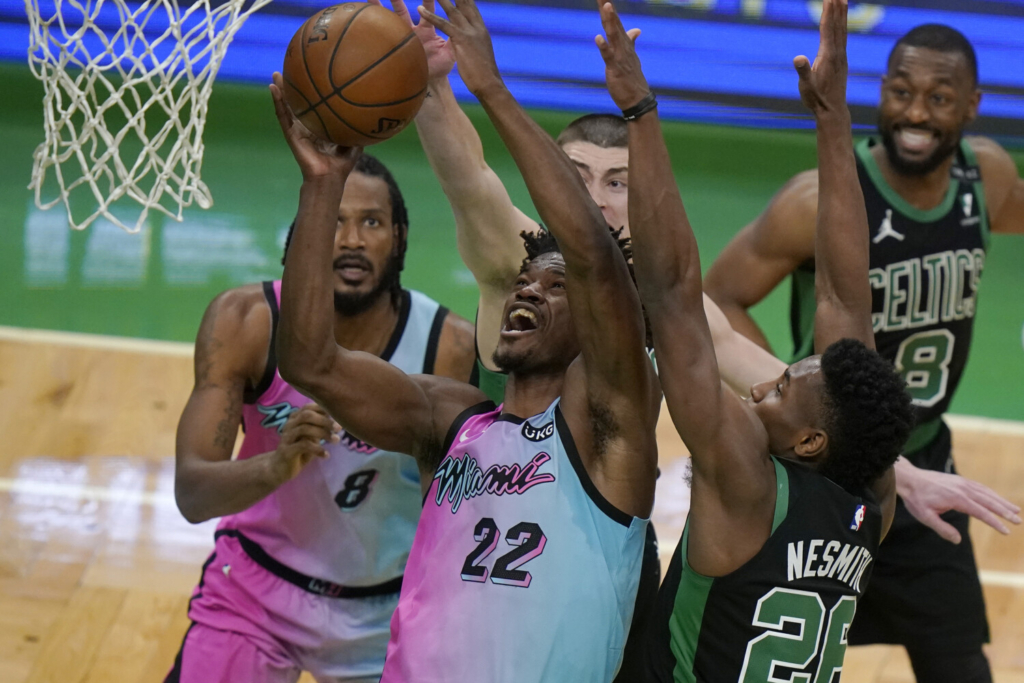Jimmy Butler of the Heat drives past Aaron Nesmith during Miami’s 130-124 win over the Celtics on Sunday at TD Garden. Steven Senne/Associated Press