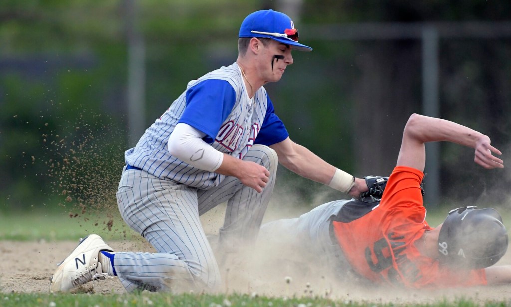 Gardiner’s Andrew Kelley slides into second base beneath a throw to Oak Hill’s Gavin Rawstron on Monday in Gardiner. Andy Molloy/Kennebec Journal Buy this Photo