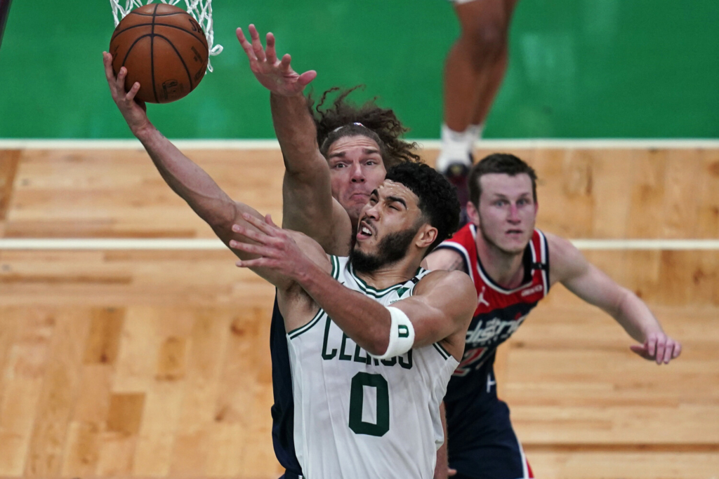 Boston Celtics forward Jayson Tatum (0) drives to the basket past Washington Wizards center Robin Lopez, rear left, during the second half of an NBA basketball Eastern Conference play-in game Tuesday, May 18, 2021, in Boston. At rear right is Wizards guard Garrison Mathews. (AP Photo/Charles Krupa) AP