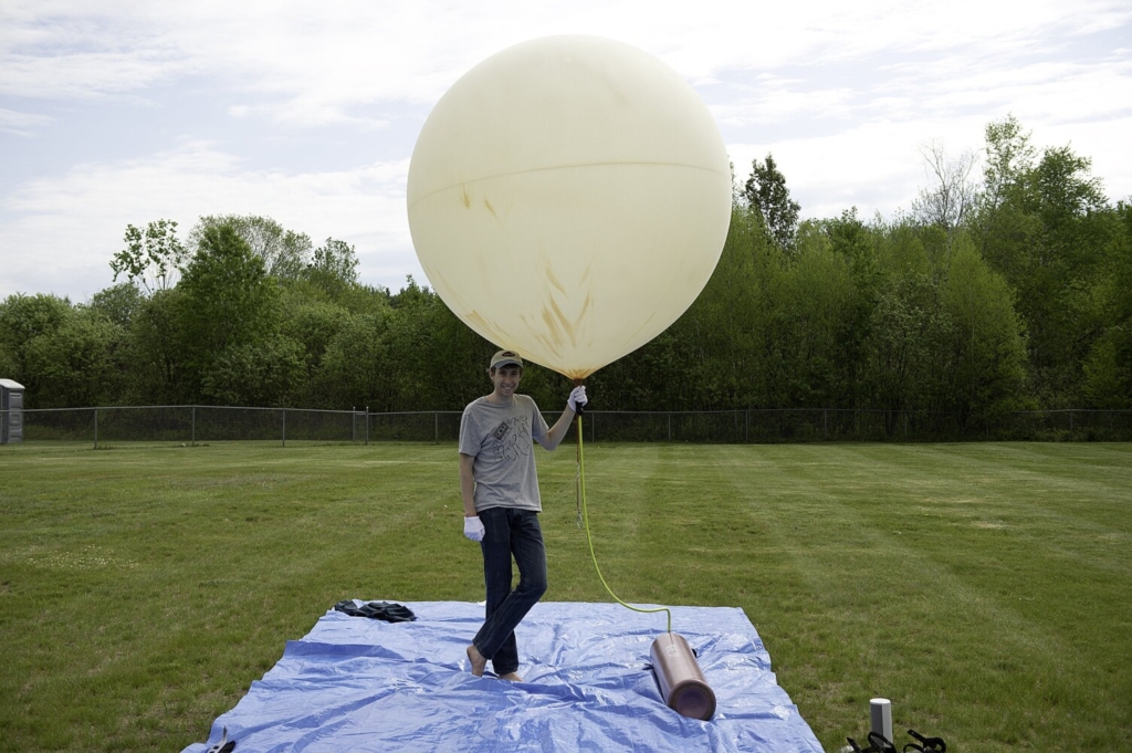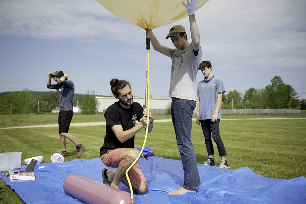 Christopher Barker, left, president of the Bates High Altitude Ballooning Club of Lewiston, and Jackson Donahue prepare a weather balloon for launch Friday in Livermore. The balloon is full of helium when it can lift four kilograms of payload, Barker said. The flight ended in a tree in Gorham. Daryn Slover/Sun Journal Buy this Photo