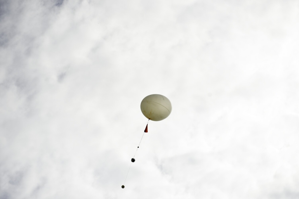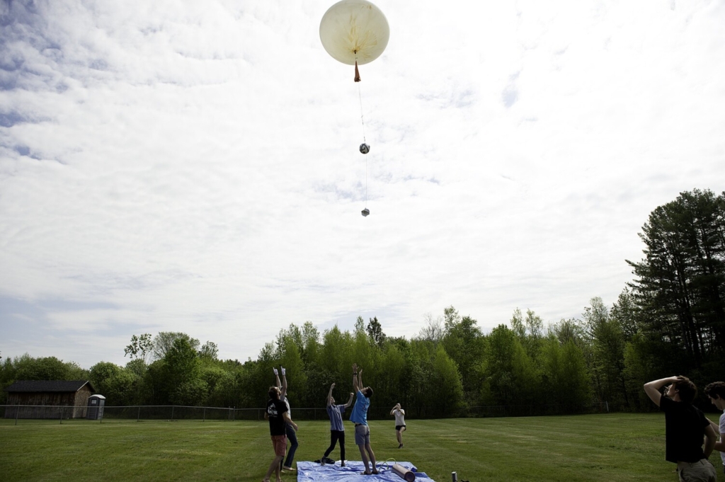 Members of the Bates High Altitude Ballooning Club of Lewiston lay back Friday and watch their weather balloon soar above Perley Field in Livermore. A GPS device on board tracked the landing to a tree in Gorham. Daryn Slover/Sun Journal Buy this Photo