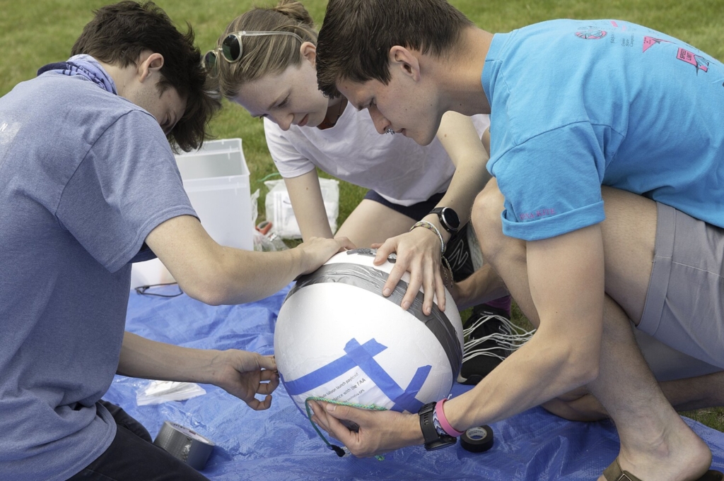 Bates College juniors Matt Clayton, left, Loren Andrews and Max Bartley of the Bates High Altitude Ballooning Club of Lewiston secure the payload Friday inside a foam sphere. A gyroscope inside the ball maintained orientation of a GPS device so students could track the balloon from Livermore accurately. “It’s our first time using a gyroscope,” Bartley said. “Every launch is different. We will see how it goes.” Daryn Slover/Sun Journal Buy this Photo