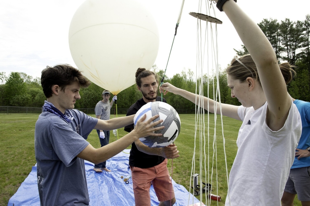 Students from the Bates High Altitude Ballooning Club of Lewiston, from left, Loren Andrews, Max Bartley, Jackson Donahue, Christopher Barker and Tucker Barber (hidden), point to their weather balloon Friday as it lifts off above Perley Field in Livermore. Barker said Perley Field was chosen based on wind patterns. The helium-filled balloon with a GPS tracker landed in a tree in Gorham. Daryn Slover/Sun Journal Buy this Photo