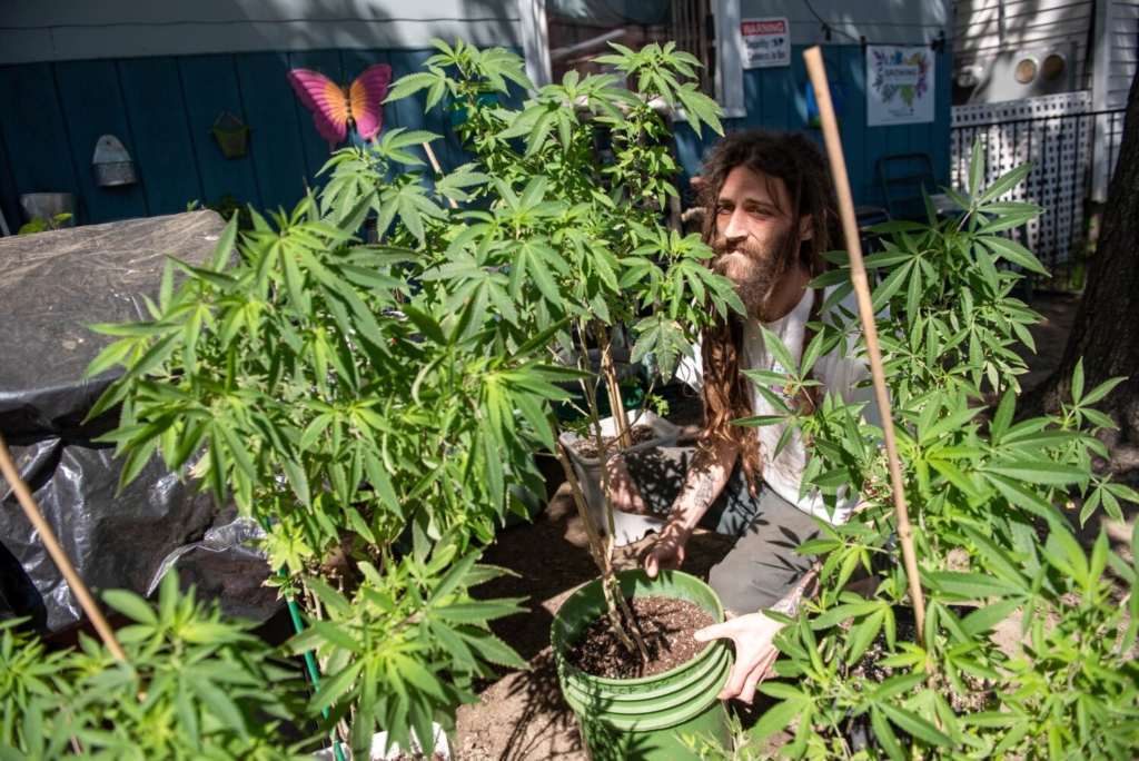 Nicholas Dunlop tends his marijuana plants Tuesday in front of his home in Lewiston. He breeds plants for use to treat pain, anxiety and depression. He grows each plant from seed and says it takes six generations for the strains to stabilize so that they yield a consistent plant. He grows one male and one female of each variety each year. Andree Kehn/Sun Journal Buy this Photo