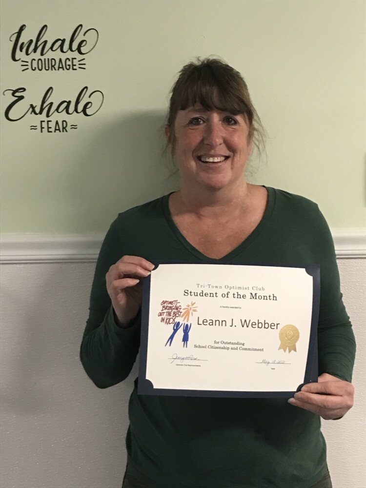 The Mechanic Falls, Minot and Poland Tri-Town Optimist Club is proud to announce its May RSU 16 Student of the Month recipient, Leann Webber, from Adult Education. Leann, a high school completion student, has shown an incredible commitment to her learning over the course of this past year, all while juggling the responsibilities of home, school and family life. Leann is described by staff as hard-working, personable, smart and dependable. She works diligently on the work she is given and has some of the most consistent attendance we have seen throughout the pandemic. Congratulations, Leann!