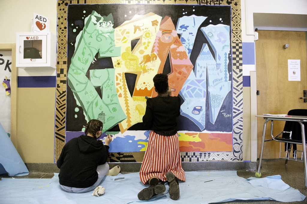 Klara Cloutier, left, and Elizabeth Ernesto create a mural Friday in the Lewiston Middle School hallway. Cloutier, a seventh-grader, and Ernesto, an eighth-grader, helped design the “Grow” mural as members of the school’s art club. Daryn Slover/Sun Journal Buy this Photo