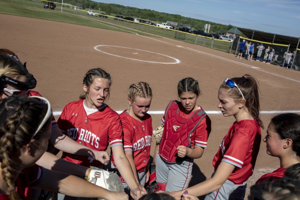 The South Portland High School junior varsity softball team huddles before a game against Falmouth on Thursday in South Portland. Brianna Soukup/Staff Photographer