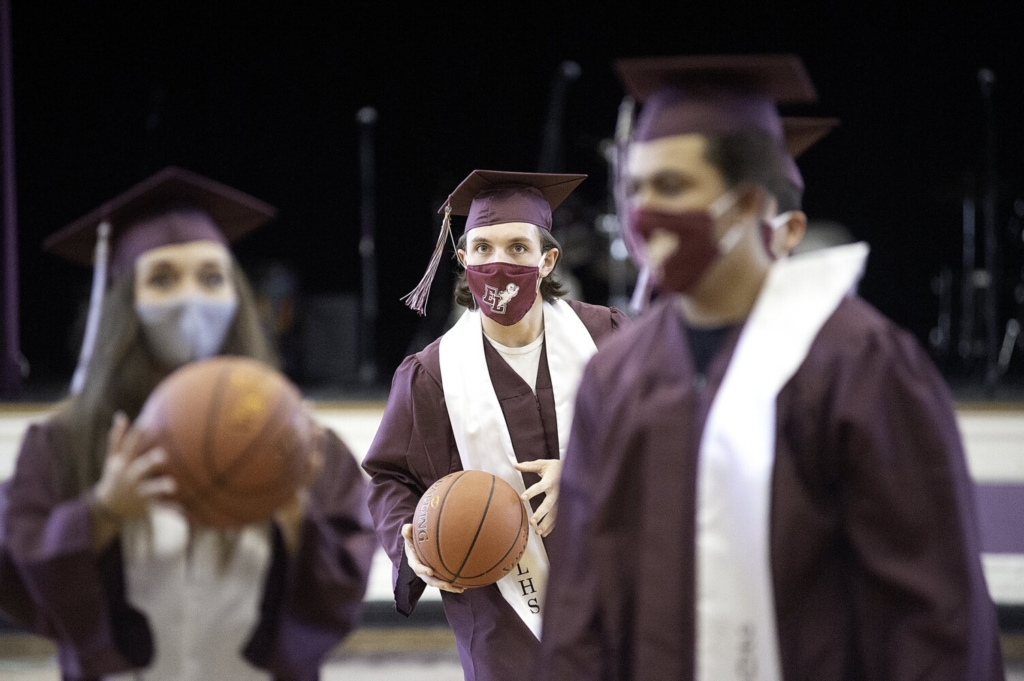 Edward Little High School senior Nick Kaiser shoots baskets Wednesday in the Walton Elementary School gym in Auburn. Each senior visited their respective elementary school while wearing their cap and gown. Kaiser graduated from the sixth grade in 2015, He will graduate from high school Saturday during a commencement ceremony on the Walton football field. Daryn Slover/Sun Journal Buy this Photo