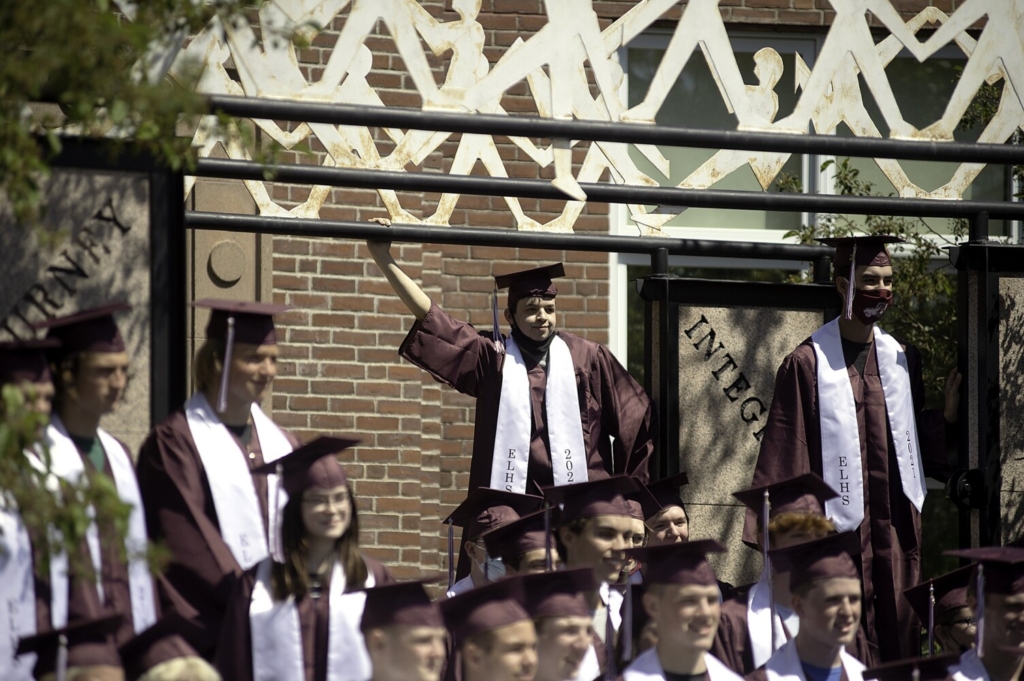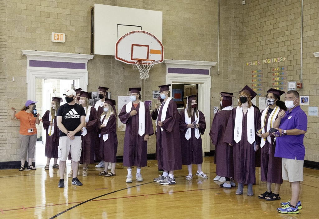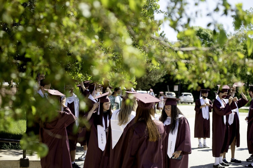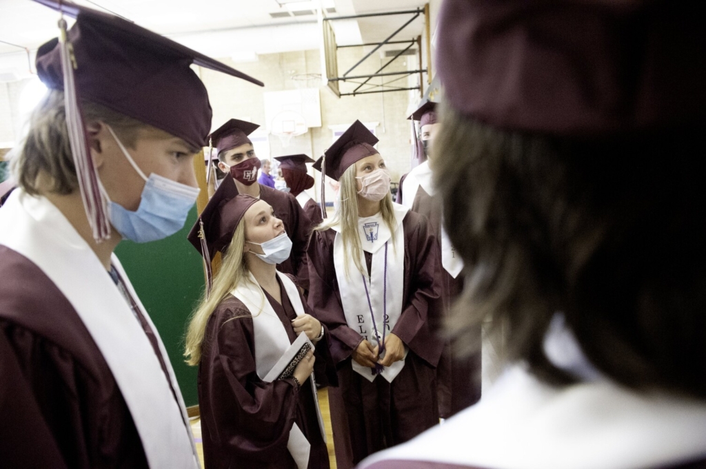 Edward Little High School seniors prepare to visit Fairview Elementary School on Wednesday in Auburn. Each senior visited their respective elementary school while wearing their cap and gown. The seniors graduated from sixth grade in 2015 with a class of 106. They will graduate from high school Saturday on the Walton football field. Daryn Slover/Sun Journal Buy this Photo