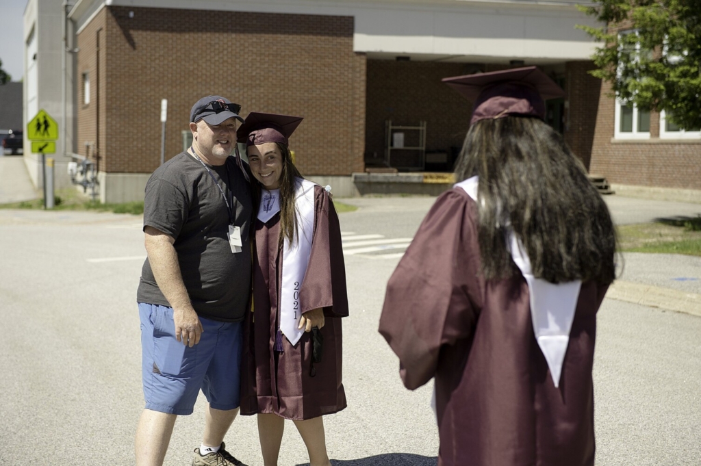 Edward Little High School graduating senior Molly Vincent has her picture taken Wednesday with her father, Greg Vincent, at Fairview Elementary School in Auburn. Each senior visited their respective elementary school while wearing their cap and gown. Greg Vincent is a teacher at Fairview and a tennis coach for the high school. Daryn Slover/Sun Journal Buy this Photo