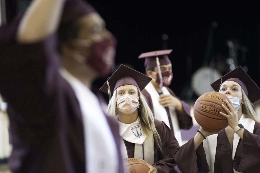 Edward Little High School graduating seniors Hannah Smith, left, and Audrey Hamel shoot baskets Wednesday in the Walton Elementary School gym in Auburn. Each senior visited their respective elementary school while wearing their cap and gown. Smith and Hamel graduated from the sixth grade in 2015. They will graduate from high school Saturday on the Walton football field. Daryn Slover/Sun Journal Buy this Photo