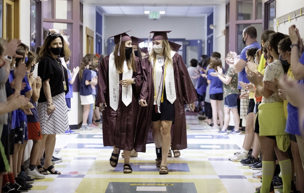 Edward Little High School seniors Emma Hefty, left, and Ella Boucher lead their classmates Wednesday down the hall at Fairview Elementary School in Auburn. Each senior visited their respective elementary school while wearing their cap and gown. Hefty and Boucher graduated from the sixth grade in 2015. They will graduate from high school Saturday on the Walton Elementary School football field. Daryn Slover/Sun Journal Buy this Photo