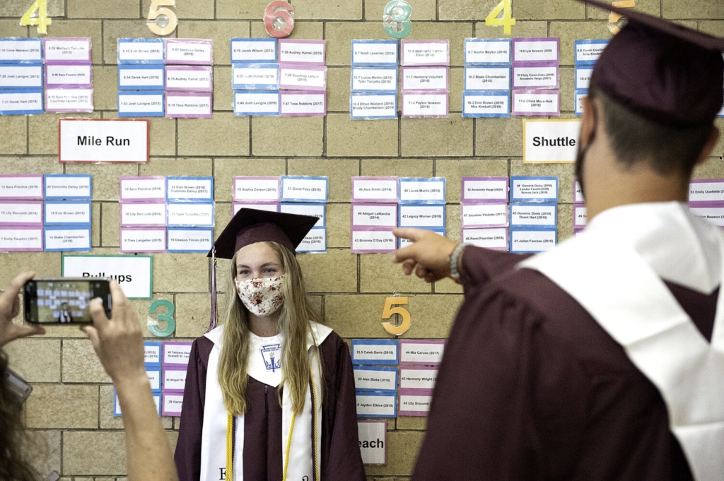 Edward Little High School senior Courtney Larson has her picture taken by her mother Wednesday in front of the record board at Walton Elementary School in Auburn. Each senior visited their respective elementary school while wearing their cap and gown. Larson had the second fastest one-mile run time by a sixth-grade girl when she graduated in 2015. She will graduate from high school Saturday on the Walton football field. Daryn Slover/Sun Journal Buy this Photo