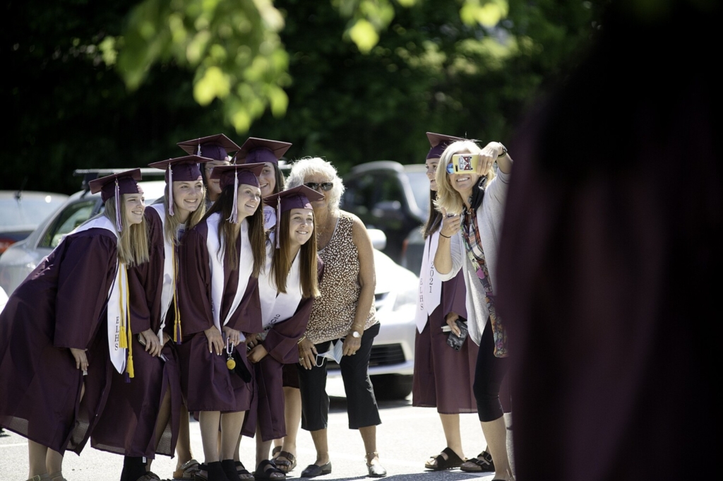 Jessica Samson takes a picture Wednesday of her daughter, Emma Samson, Emma’s classmates and her mother, Diane Cates, at Fairview Elementary School in Auburn. Each ELHS senior visited their respective elementary school while wearing their cap and gown. Emma Samson, third from left, is the third-generation member of her family to graduate from ELHS. Diane Cates graduated from ELHS in 1966. Jessica Samson graduated in 1991 and Emma Samson will graduate Saturday during a commencement ceremony on the football field at Walton Elementary School. Daryn Slover/Sun Journal Buy this Photo