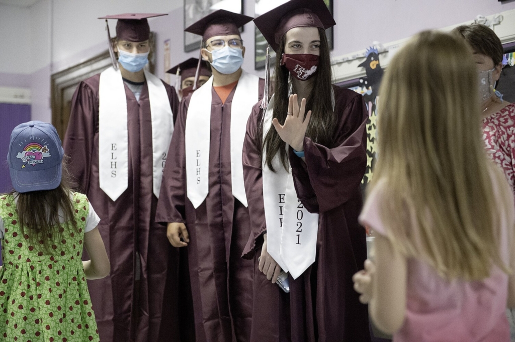 Edward Little High School seniors Kyleigh McDonough, right, Colin Merritt and Clay Robbins wave Wednesday to young students at Walton Elementary in Auburn. Each senior visited their respective elementary school while wearing their cap and gown. McDonough, Merritt and Robbins graduated from the sixth grade in 2015. They will graduate from high school Saturday during a commencement ceremony on the Walton football field. Daryn Slover/Sun Journal Buy this Photo