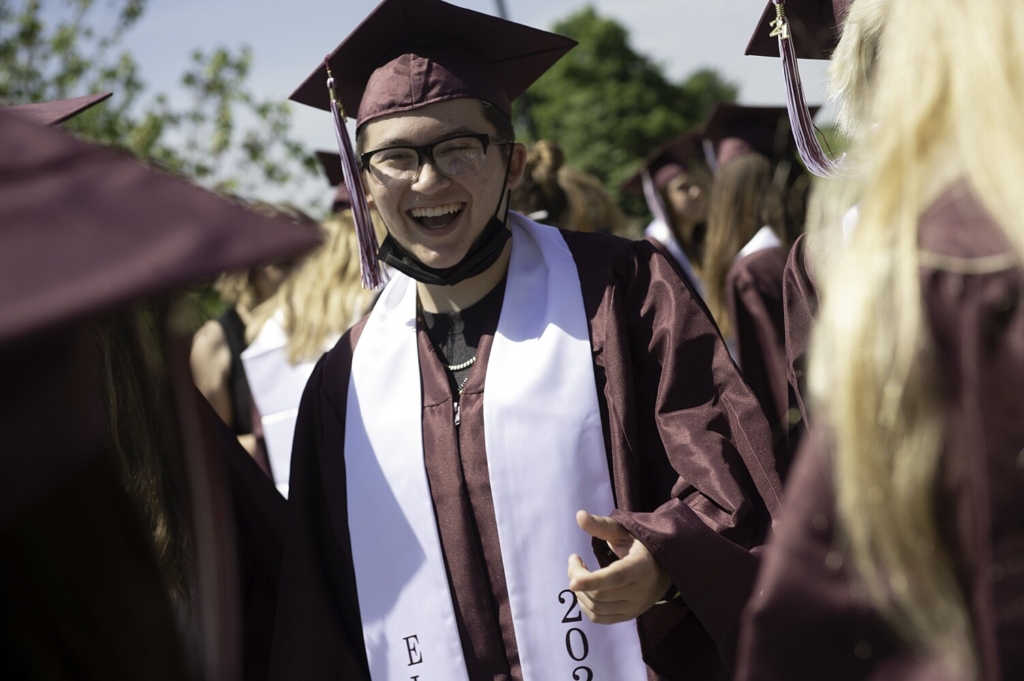 Edward Little High School senior Izzac MacDonald laughs Wednesday at Fairview Elementary School in Auburn. Each senior visited their respective elementary school while wearing their cap and gown. MacDonald graduated from the sixth grade in 2015 and will graduate from high school Saturday. Daryn Slover/Sun Journal Buy this Photo