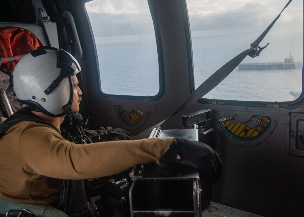 Naval Air Crewman (Helicopter) 2nd Class Peter Hoffman, from Maine, attached to the Golden Falcons of Helicopter Sea Combat Squadron (HSC) 12 watches as the U.S. Navy’s only forward-deployed aircraft carrier, USS Ronald Reagan (CVN 76), steams in the Philippine Sea. Ronald Reagan, the flagship of Carrier Strike Group 5, provides a combat-ready force that protects and defends the United States, as well as the collective maritime interests of its allies and partners in the Indo-Pacific region. U.S. Navy photo by Mass Communication Specialist 3rd Class Michael B. Jarmiolowski