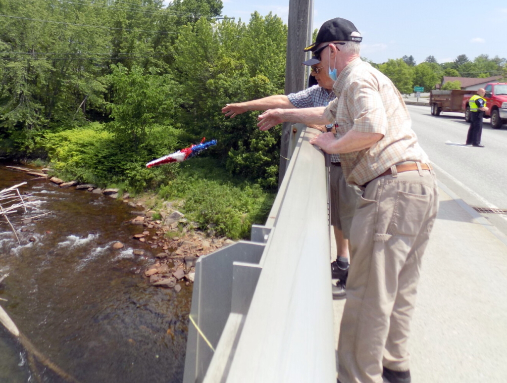 Veterans Douglas Hand and Rodney Titcomb served as color guard, marching the American and Veterans of Foreign War flags to the middle of Center Bridge.