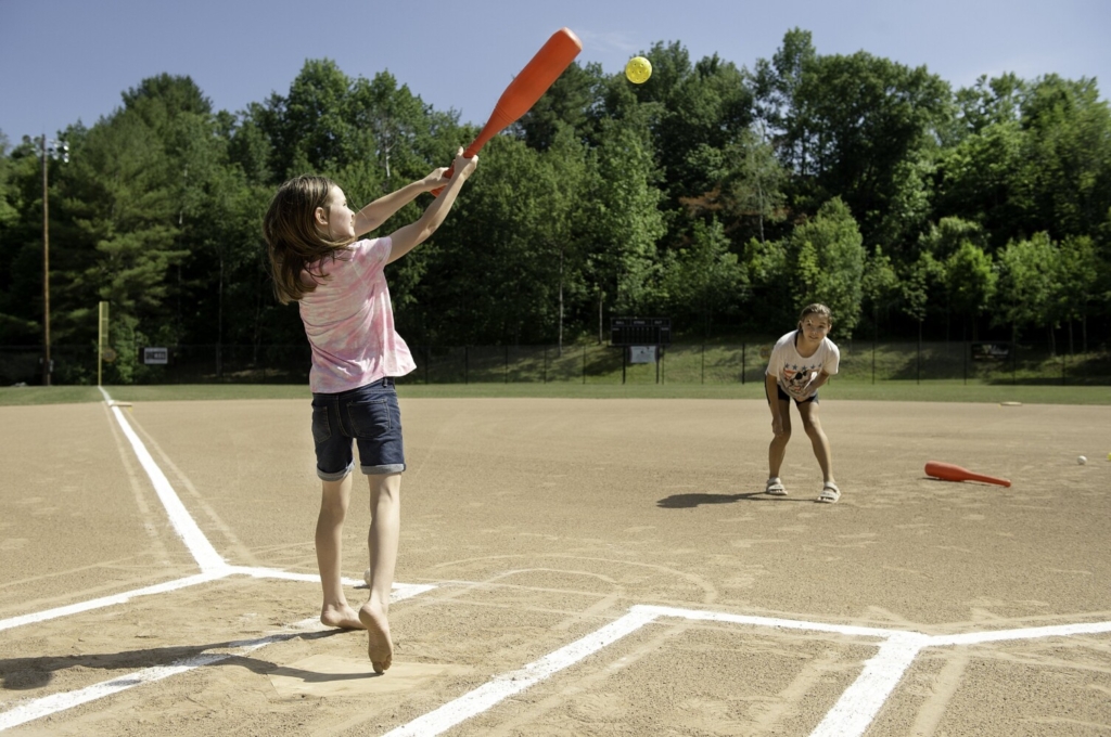Cadence Ogilvie, 9, hits a Wiffle ball pitched by Wylder Demers-Dube on Friday at Pettengill Park in Auburn. Demers-Dube said friends from the neighborhood come down to the park to play ball often. Daryn Slover/Sun Journal Buy this Photo
