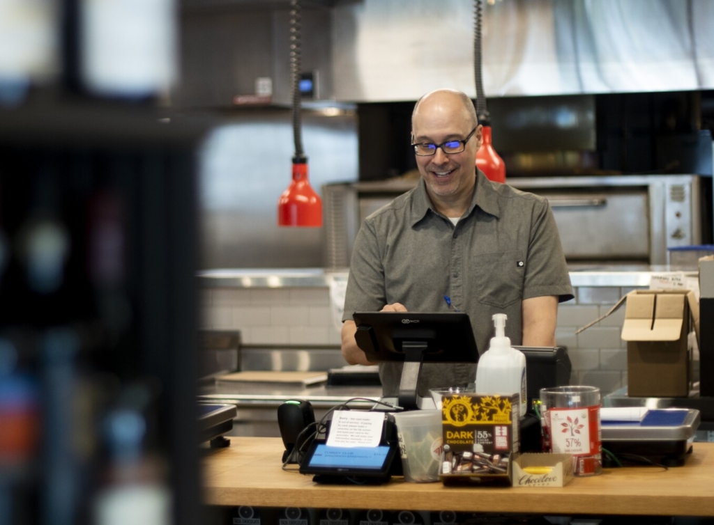 Steve Quatrucci, owner of Monte’s Fine Foods, works at a register on Friday. Derek Davis/Staff Photographer