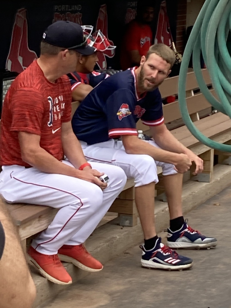 Red Sox pitcher Chris Sale speaks with Sea Dogs pitching coach Lance Carter last month at Hadlock Field in Portland. Kevin Thomas photo