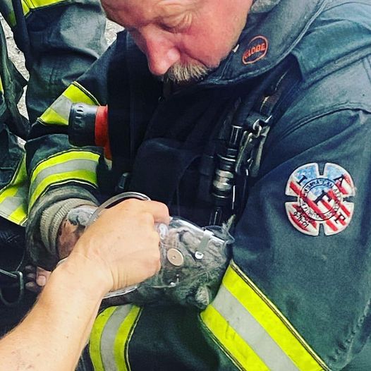 Auburn Fire Capt. Chris Moretto administers oxygen Monday to a cat found trapped on the third floor of an apartment building on High Street. Derek Drouin/Auburn Fire Department Facebook
