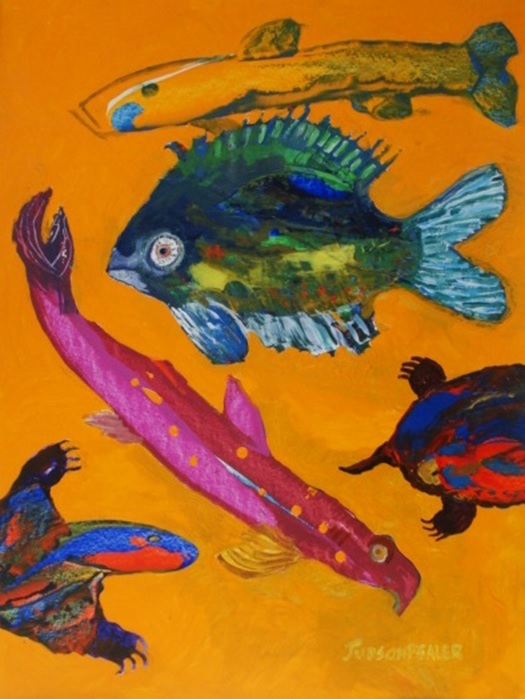 Pealer’s work includes bright color combinations of various types of fish in a playful cartoon style. He is known as an abstract artist and when asked about the emergence of these fish he says, “I wonder about that. It is another way to explore our own situation. How are these creatures like us? They face limitations just like we do. I think they are a push back against the confinements many of us have felt during the pandemic as well as expressing some of the helplessness we may have felt about our situation.”