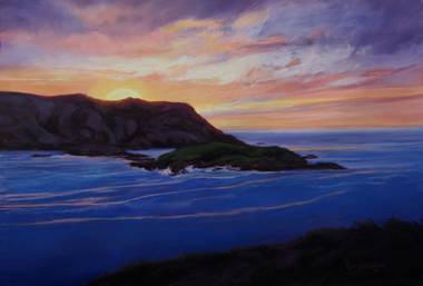 “West from Monhegan,” acrylic and soft pastel on paper, is part of an art show by Sally Loughridge on display through August at the Central Lincoln County YMCA.. Contributed photo