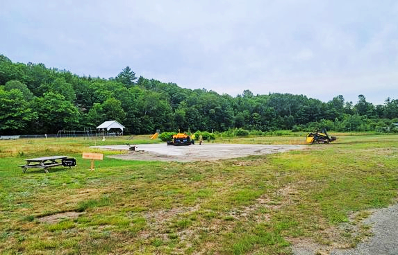 The new regulation-sized court now has been hot topped. We have top of the line basketball poles, backboards, and nets, along with two shorter poles for the younger players. A new Memorial sign will be installed shortly, and we also have regulation line painters hopefully coming soon from Vermont to paint the official lines on the court.