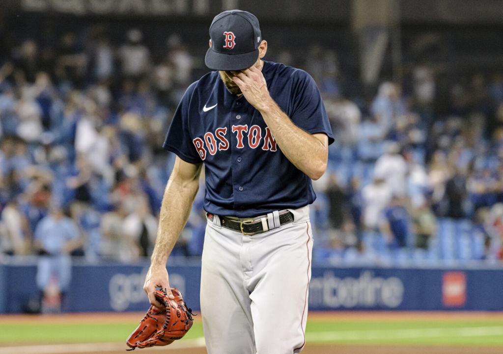 Red Sox starting pitcher Nathan Eovaldi leaves during fifth inning Friday against the Toronto Blue Jays. Boston gave up nine runs in the inning and lost, 12-4. Christopher Katsarov/The Canadian Press via AP