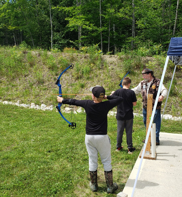 Will Sampson helps young people try archery during the recent Youth Field Day at Wilton Fish & Game. He will be offering archery workshops from 12:30 to 2 p.m. on August 7 at the club’s Open House during the Blueberry Festival. Submitted photo
