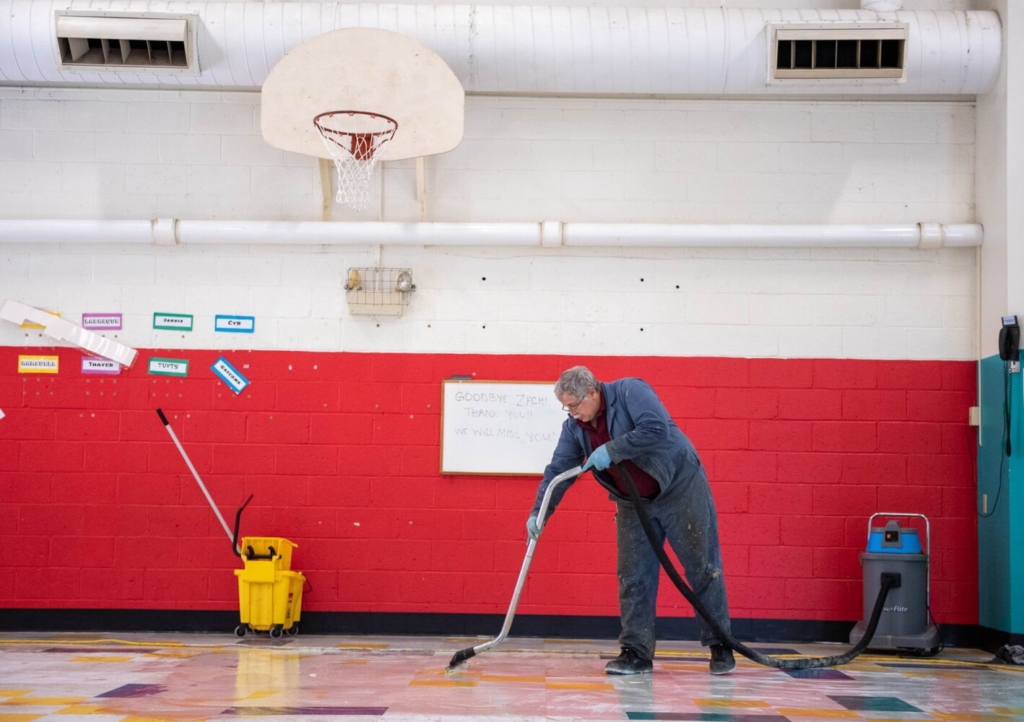 Brian Hess, head custodian at Washburn Elementary School in Auburn, strips the cafeteria floors Tuesday before waxing them. Staff is preparing buildings and equipment for opening day of school. Andree Kehn/Sun Journal
