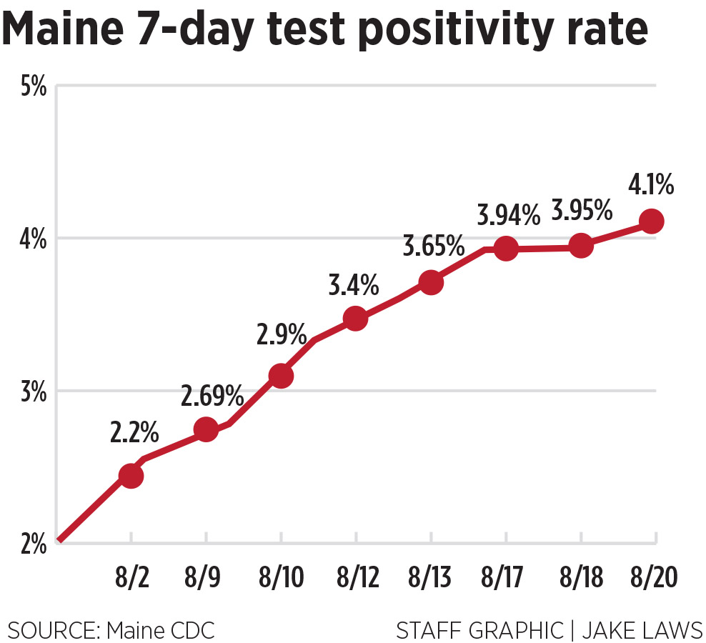 The state reported Friday that the positive test rate had risen to 4.1 percent, averaged over seven days. That’s below the peak in January – when it spent several weeks above 6 percent – and far below the national rate of 9.5 percent. But the new figure shows just how much the virus has circulated here in a short time. On July 7, the rate was the lowest recorded during the pandemic in Maine, just 0.45 percent.