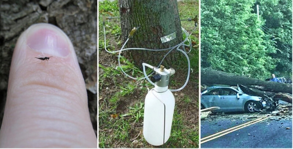 Parasitic wasp used for biocontrol of EAB (photo by BillMcNee-Wisconsin DNR), trunk injection to protect ash tree (photo by MSU), infested ash trees easily break and cause damage (photo by Sarah Courtney/Jefferson Township Dads and Moms Facebook group).